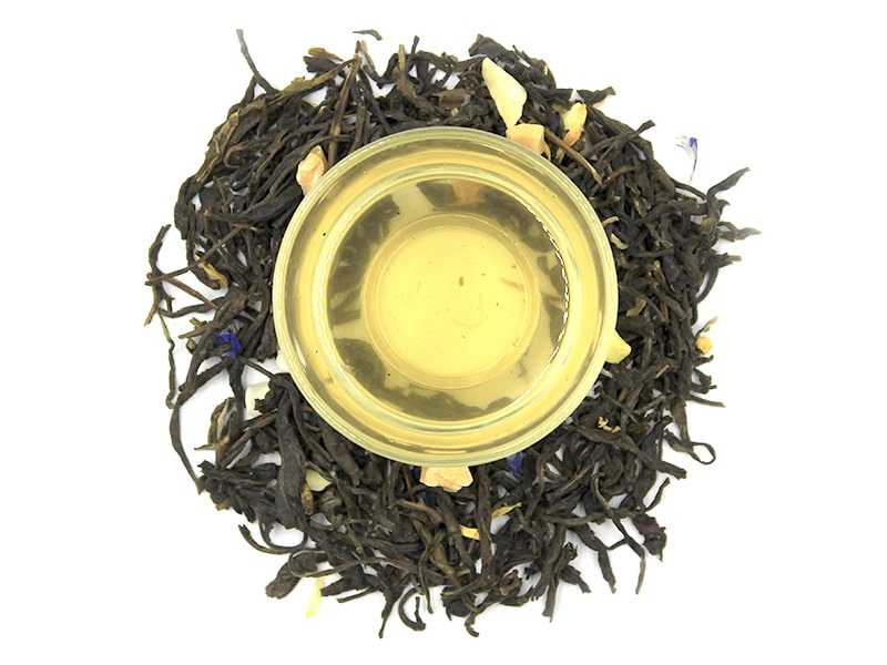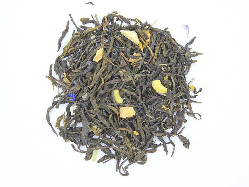 Склад: чай китайский зелений (великий лист), цукати ананаса, пелюстки календули, пелюстки волошки, ароматизатор абрикос.